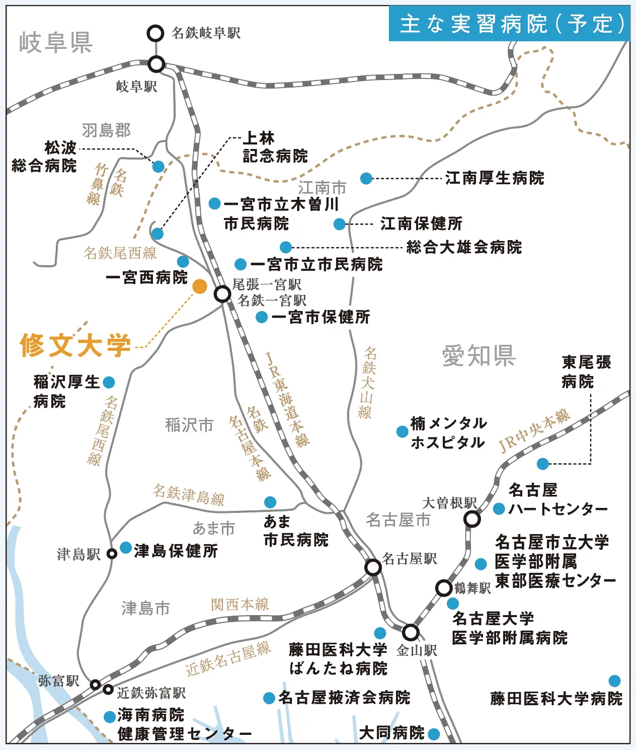 「看護は実践の科学」という考えのもと、1年次から臨地実習を行います。臨地実習先は、地元一宮を中心に尾張西部・名古屋の病院が中心。臨地実習中は、医療現場での活動に加え、翌日の看護計画を立てるなど多くの時間を要するため、心身ともに万全の状態で取り組めるよう配慮しました。