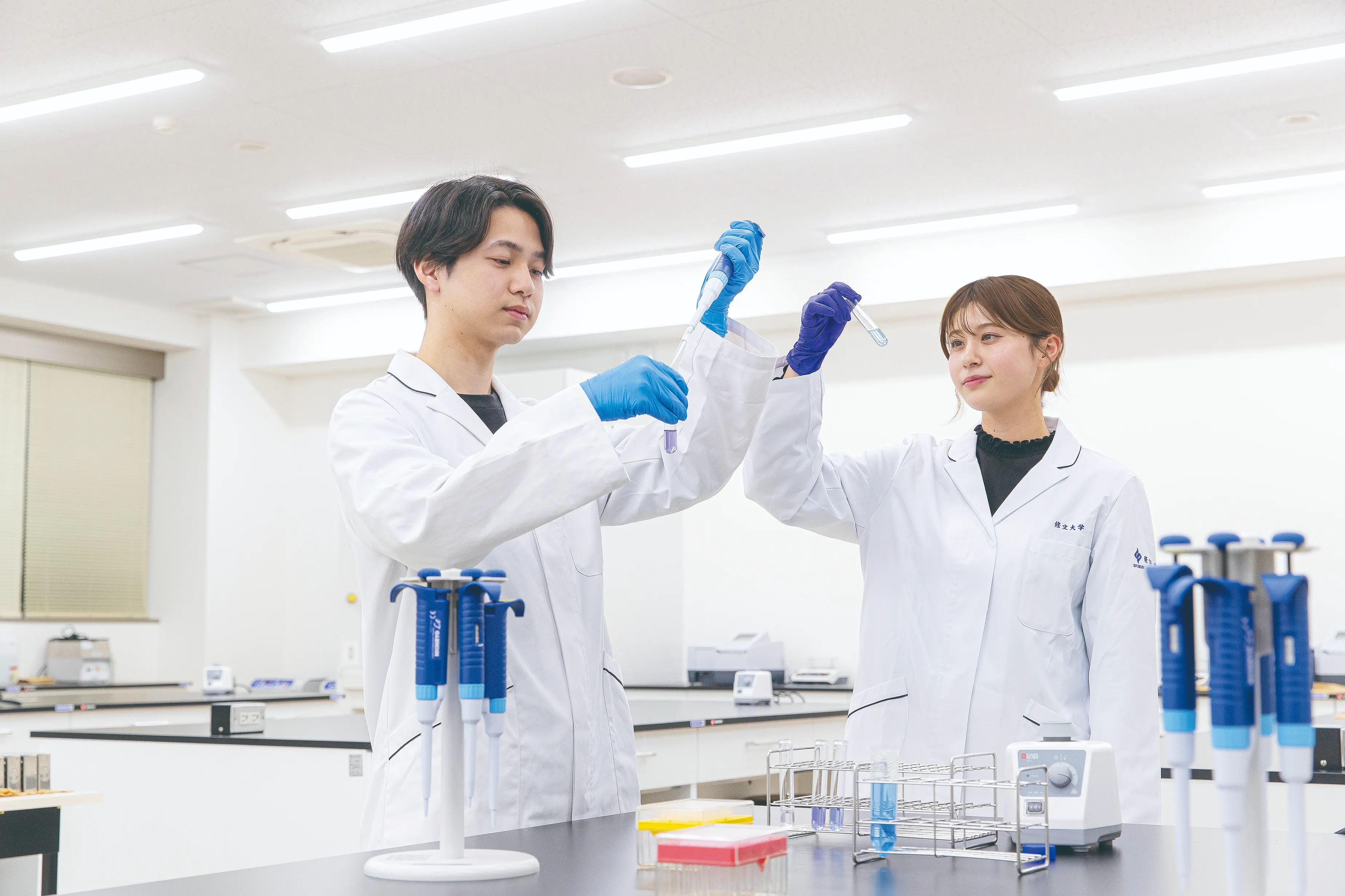 医療科学部臨床検査学科設置に伴い新しく建設された11号館と既設の9号館4階フロアは、実験室、共同研究室、分野別実習室や教員研究室などで構成されています。各実習室等にはフローサイトメーターや超音波診断装置、マルチディスカッション顕微鏡などの最新の設備が整っています。