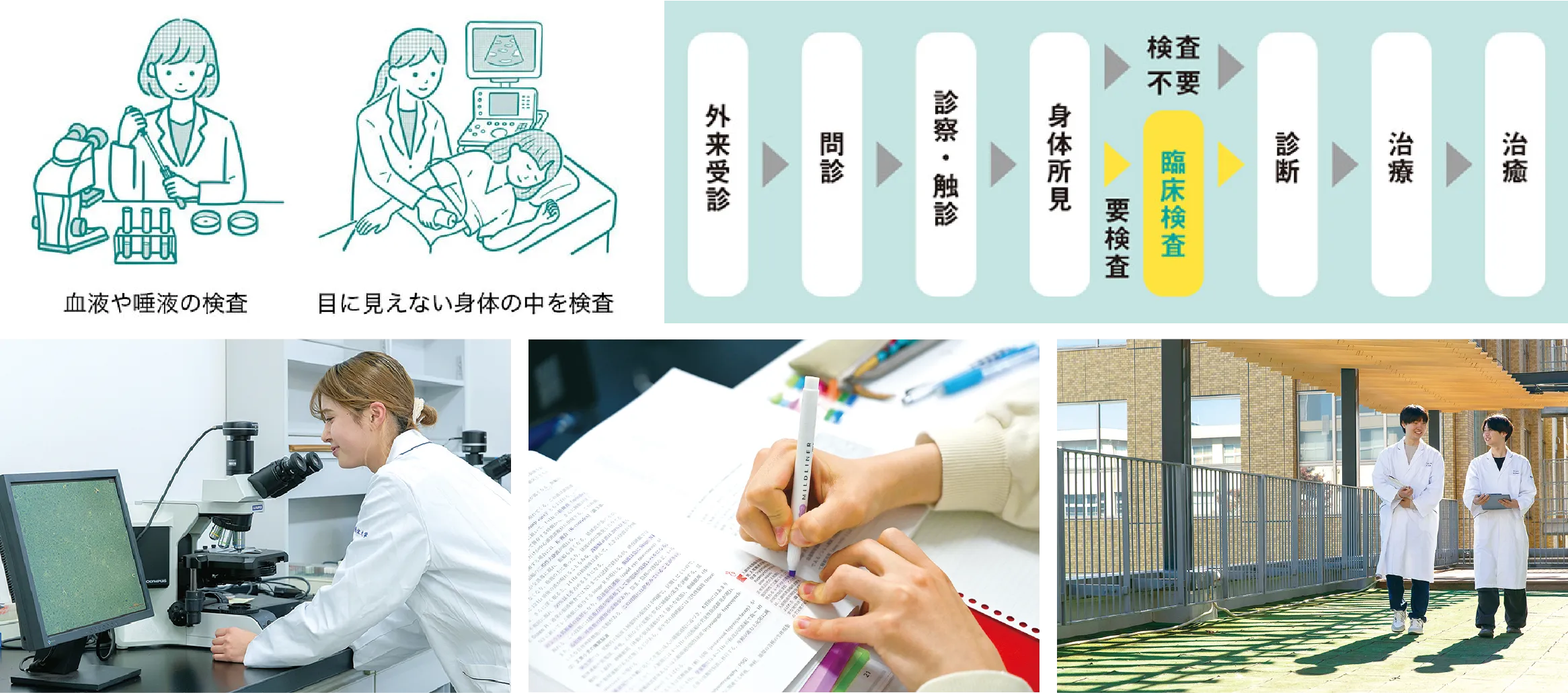 医療を支える重要な役割を果たすために、得られた検査結果を医療者に適切に説明することができることはもちろん、チーム医療を実践するにあたって求められる協調性と幅広い専門知識、実践的で高度な技術に加えて、多職種連携に必要なコミュニケーション能力と協働性を身につけることを重視します。