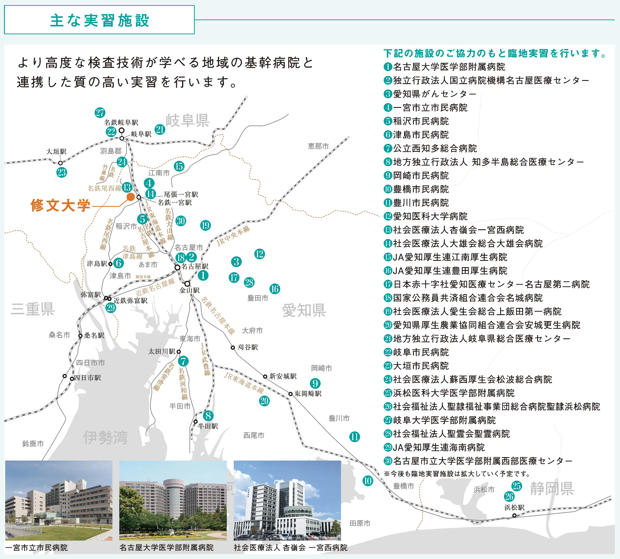 臨地実習受入れ先を入学生の出身地を考慮しながら依頼し、臨地実習環境を充実させています。現在は、地元一宮を中心に尾張・名古屋・三河・岐阜・浜松地域の病院が臨地実習先になります。3年次に実施される臨地実習では、医療現場で、臨床検査技師の仕事を実践的に学びます。これまで大学で学んできた知識・技術を生かして臨床の現場での実習を行い、大きく成長していくことが臨地実習の目的です。