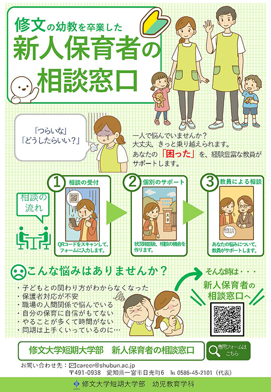 このたび、修文大学短期大学部幼児教育学科では、卒業生の早期離職を防ぐために、「卒業後の悩みサポート・ホットライン」を開設しました。