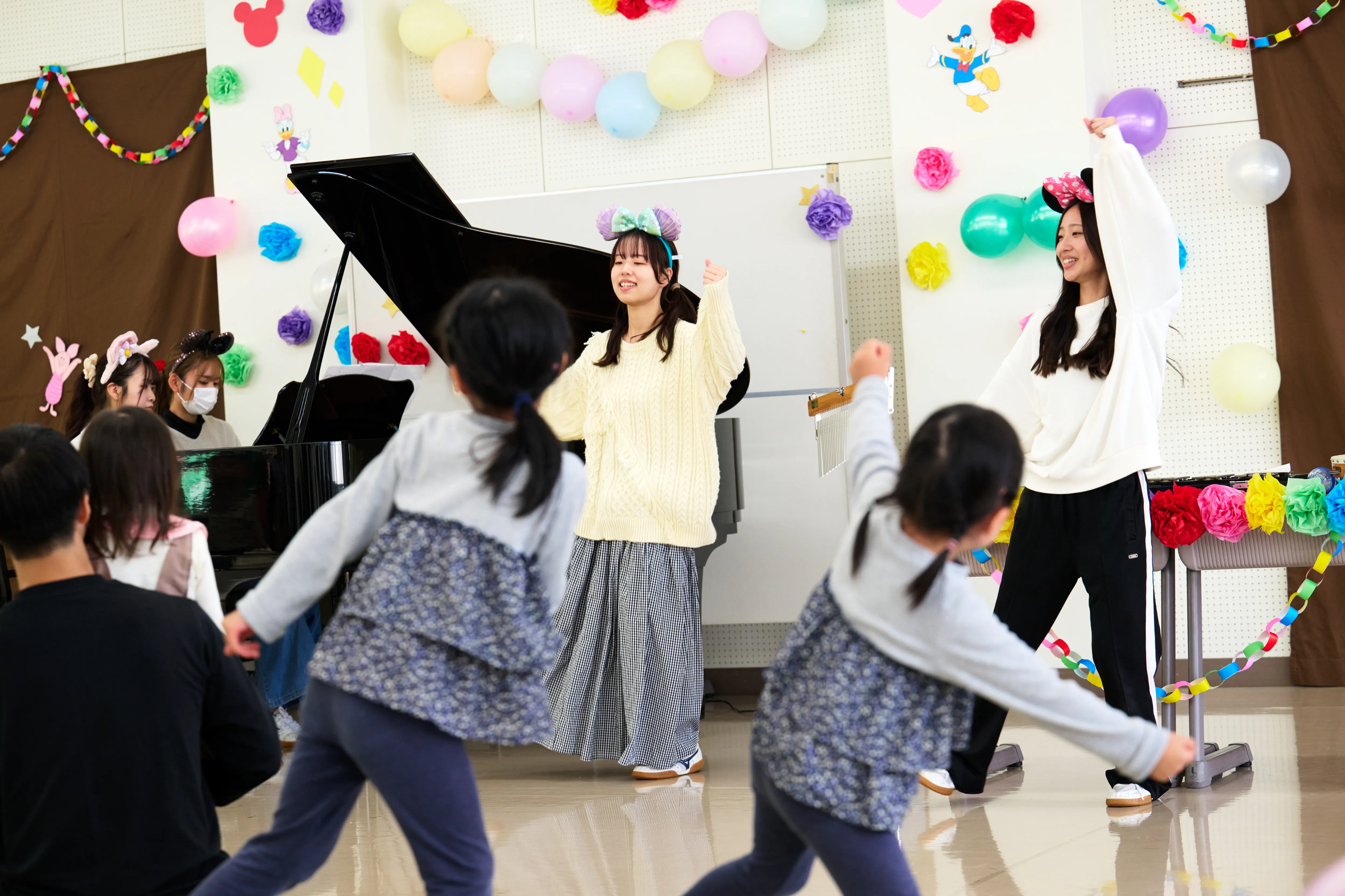 学生たちの日ごろの学びの成果を発表し、こどもたちに楽しんでもらうイベントです。学生が身につけたあそびを提供します。ピアノ演奏、紙芝居、運動あそび、楽器づくりや工作など、盛りだくさんのイベントになっています。